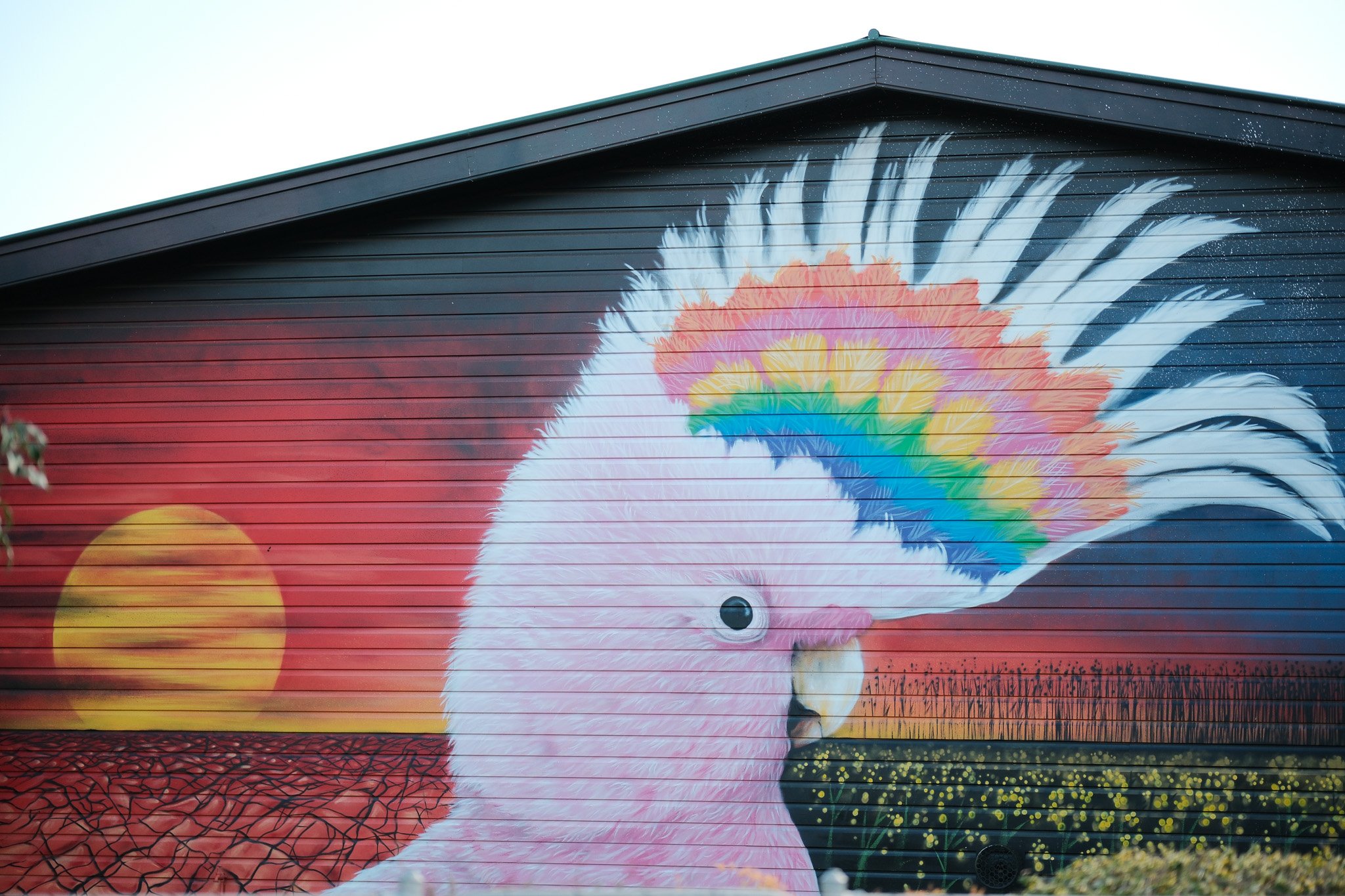 On the wall of Barellan Central School, you’ll find a striking pink cockatoo mural popping out against the wheatbelt landscape; bold, graphic and unmissable.